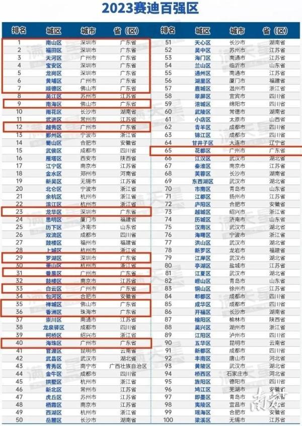 前“十强”中,广东入围8席,数量与去年持平,其中深圳南山区继续稳居首位,前7位均来自广东,深圳福田区、广州天河区、深圳宝安区、深圳龙岗区、广州黄埔区、佛山顺德区分列2~7名,另外佛山南海区列第9。