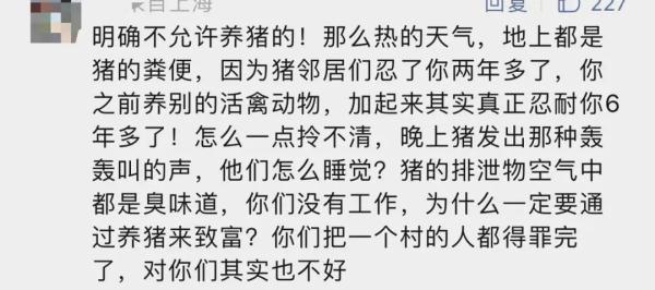大团镇规建办工作人员陶恒:搭建猪舍要看房子原来的属性,重新搭建肯定是不允许的,但他有权力用旧有房舍进行养殖。就环评而言,要达到养殖场规模(2500头以上)才能涉及环评,一般养殖只需做备案。养殖户的行为显然已经给邻居生活带来了严重影响,所以猪舍是一定要清退的。