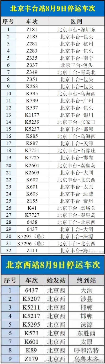 受水害影响,今天(9日)北京西站、北京丰台站部分列车停运,已购买停运列车车票的旅客,可于30日内办理全额退票手续。请广大旅客合理安排出行,关注铁路部门公告。(北京西站、北京丰台站)