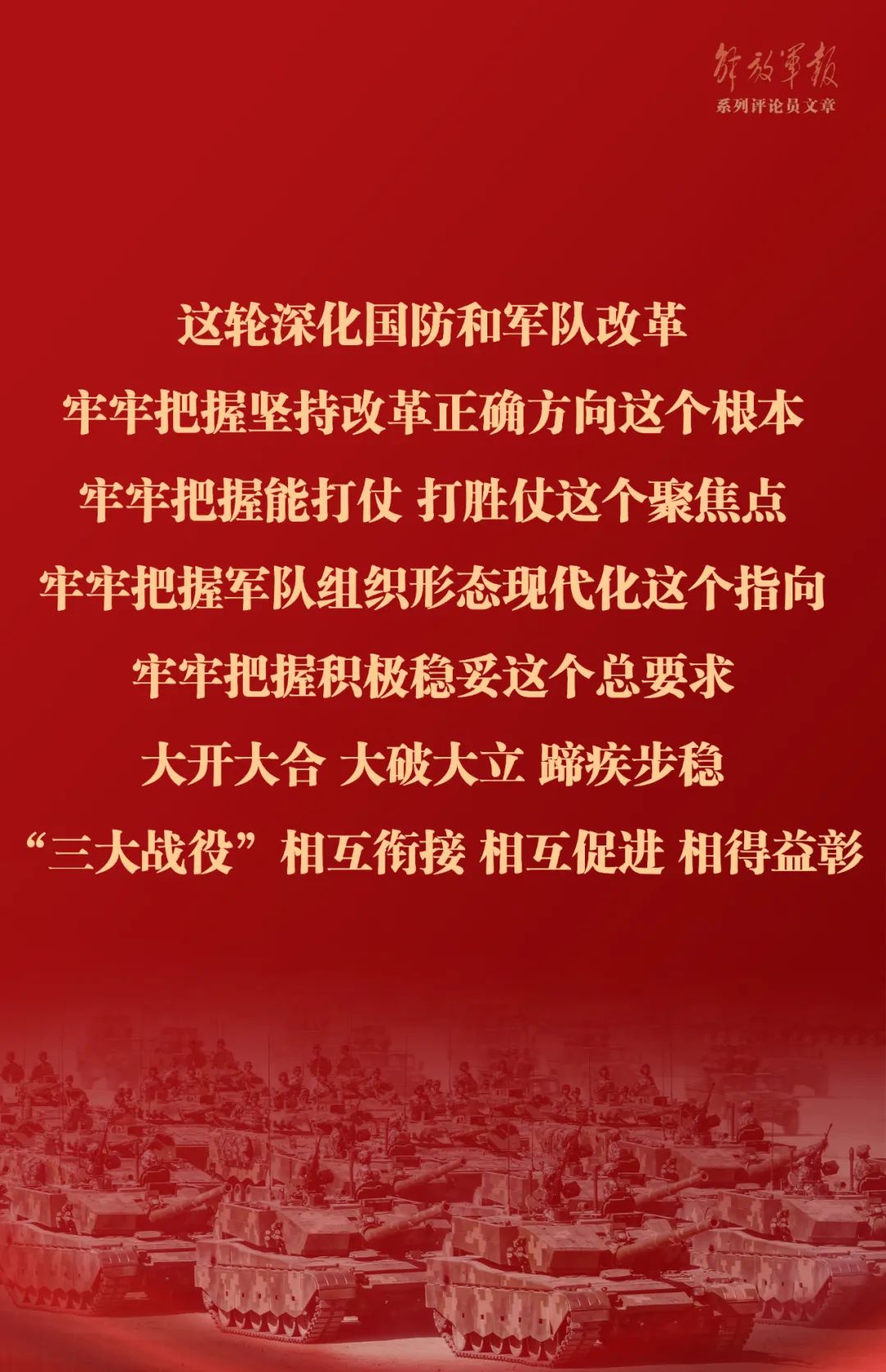 习主席指出,深化国防和军队改革是实现中国梦强军梦的时代要求,是强军兴军的必由之路,也是决定军队未来的关键一招。这轮深化国防和军队改革,牢牢把握坚持改革正确方向这个根本,牢牢把握能打仗、打胜仗这个聚焦点,牢牢把握军队组织形态现代化这个指向,牢牢把握积极稳妥这个总要求,大开大合、大破大立、蹄疾步稳,“三大战役”相互衔接、相互促进、相得益彰——