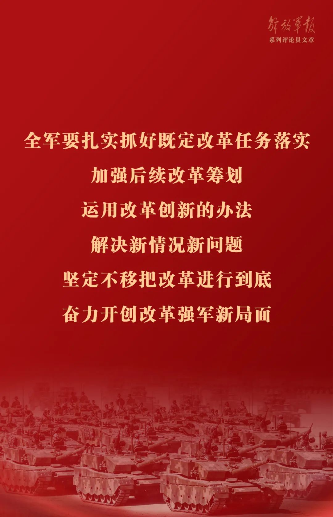 党的二十大对巩固拓展国防和军队改革成果作出战略部署。全军要认真总结运用改革成功经验,把握新的形势和任务要求,聚焦备战打仗,勇于开拓创新,扎实抓好既定改革任务落实,加强后续改革筹划,以坚强的党性、高度的觉悟、振奋的精神把各项改革任务完成好,保持永远在路上的坚韧和执着,运用改革创新的办法解决新情况新问题,坚定不移把改革进行到底,奋力开创改革强军新局面,为实现建军一百年奋斗目标提供强大动力。
