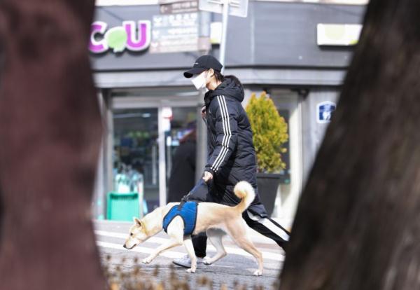 2020年2月26日,在韩国首尔,一名市民遛狗。新华社记者王婧嫱摄