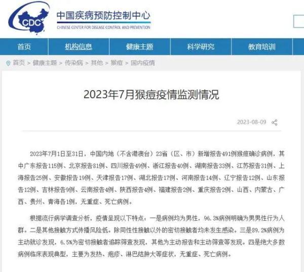 2023年7月1日至31日,中国内地(不含港澳台)23省(区、市)新增报告491例猴痘确诊病例,其中广东报告115例、北京报告81例、四川报告49例、浙江报告40例、湖南报告33例、江苏报告31例、上海报告25例、安徽报告19例、天津报告17例、湖北报告17例、河南报告14例、辽宁报告12例、山东报告12例、吉林报告9例、云南报告4例、陕西报告4例、福建报告2例、重庆报告2例、山西、内蒙古、广西、贵州、青海各1例,无重症、死亡病例。