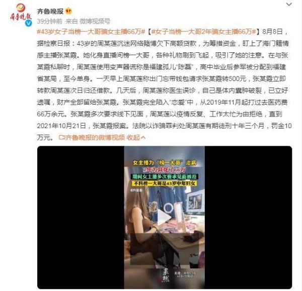 8月8日,据检察日报:43岁的周某莲沉迷网络赌博欠下高额贷款,为筹措资金,盯上了海门籍情感主播张某霞。她化身直播间榜一大哥,各种礼物刷到飞起,吸引了她的注意。在与张某霞私聊时,周某莲使用变声器谎称是福建孤儿“陈磊”,高中毕业后参军被分配到福建省某局,至今单身。一天早上周某莲称出门忘带钱包请求张某霞转500元,张某霞立即转款周某莲次日归还借款。几天后,周某莲称医生误诊,自己是体内囊肿破裂,已立好遗嘱,财产全部留给张某霞。张某霞完全陷入“恋爱”中,从2019年11月起打过去医药费66万余元。张某霞多次要求线下见面,周某莲以疫情反复、工作太忙为由拒绝,直到2021年10月21日,张某霞报案。法院以诈骗罪判处周某莲有期徒刑十年三个月,罚金10万元。