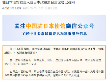 答:这是不自量力,胡言乱语。同时,这些说法干涉中国内政,破坏台海稳定,中方已向日方提出严正交涉。
