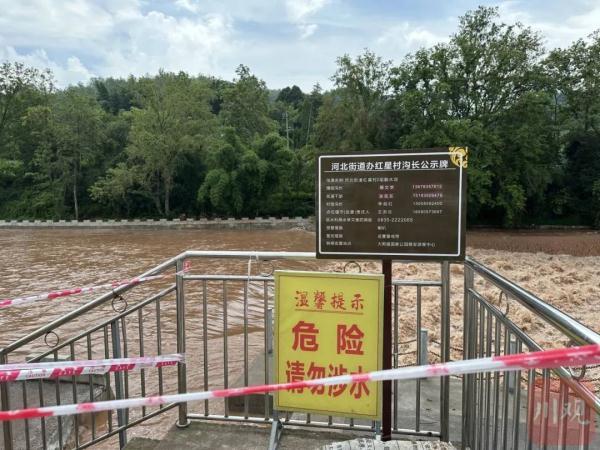 上午11时,记者在河北街道红星村2组翻水坝(即网红打卡点鱼鳞坝)看到,事发地点河水汹涌湍急,现场拉起警戒线,设有“请勿涉水”标识。
