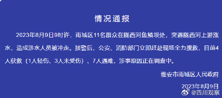 8月9日,雅安市雨城区人民政府发布情况通报:2023年8月9日9时许,雨城区11名群众在陇西河鱼鳞坝处,突遇陇西河上游涨水,造成涉水人员被冲走。接警后,公安、消防部门立即赶赴现场全力搜救,目前4人获救(1人轻伤、3人未受伤)、7人遇难,涉事原因正在调查中。