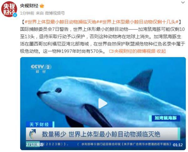 国际捕鲸委员会7日警告,世界上体形最小的鲸目动物——加湾鼠海豚可能仅剩10至13头,亟待采取行动予以保护,否则这种动物将在地球上消失。加湾鼠海豚生活在墨西哥加利福尼亚湾北部海域,在世界自然保护联盟濒危物种红色名录中属于极危动物。这一物种1997年时尚有570头。
