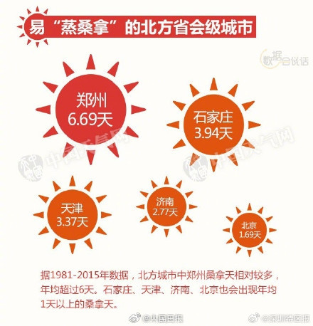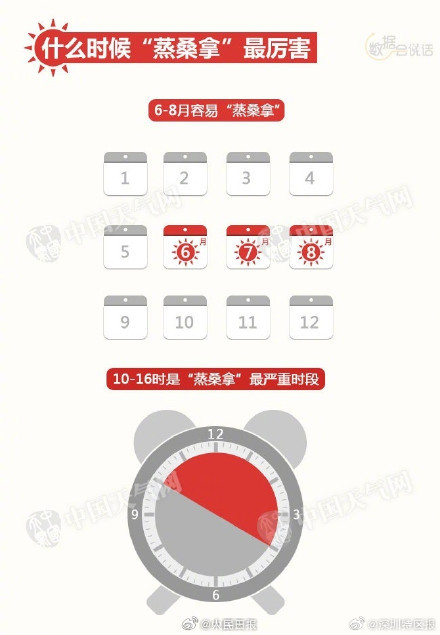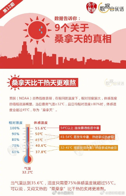 相同温度下,相对湿度越大,体感温度增幅就越明显。当日最高气温≥32℃,且日均相对湿度≥80%时,体感温度会超45℃,称为桑拿天。遇上桑拿天,如何安全度过?