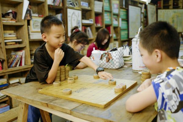 图为8月2日,两个男孩在重庆市九龙坡区黄桷坪街道的一家书屋下棋。 记者刘潺 摄