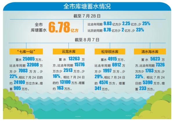 截至目前,全市库塘蓄水出现一定增蓄,但总体蓄水量仍少于去年同期。截至7月28日,全市库塘蓄水6.78亿方,比去年同期9.03亿方少2.25亿方、少25%,比历史同期8.78亿方少2亿方、少23%。