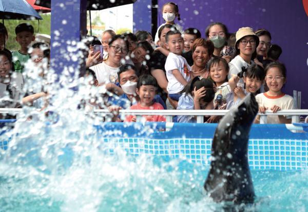6月24日,浙江省乐清市端午嘉年华活动现场,市民观看海狮表演