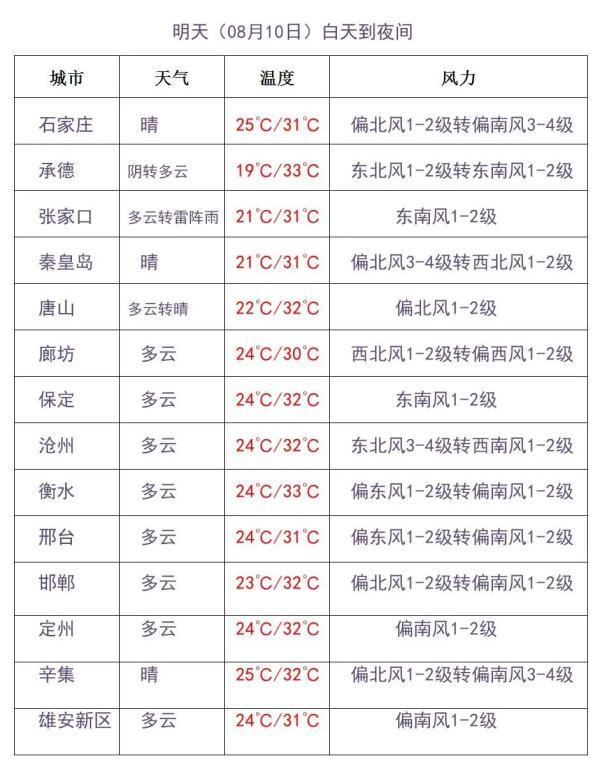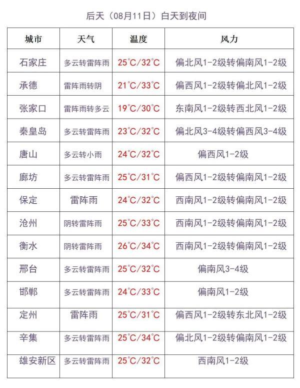 明天夜间到11日,张家口、承德、保定、廊坊、雄安新区、石家庄西部、邢台西部、邯郸西部多云转阴有雷阵雨或阵雨,局地有中到大雨,个别地点有暴雨,雷雨时局地伴有短时强降水、短时大风等强对流天气,其他地区多云间阴。