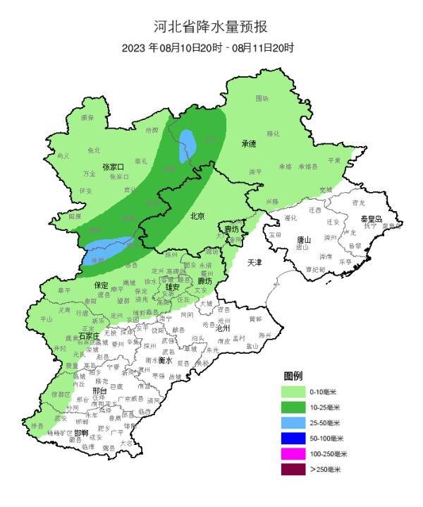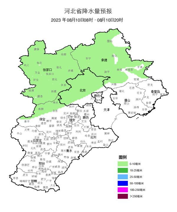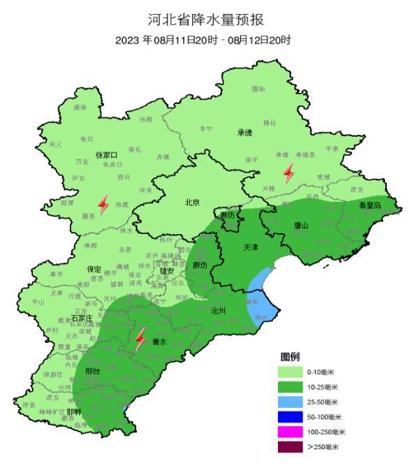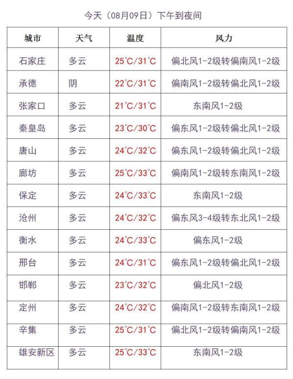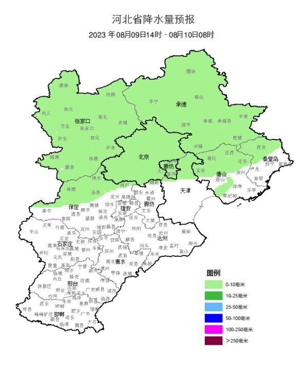 河北省气象台2023年08月09日14时发布未来6小时天气预报:预计未来6小时,张家口、承德、唐山西部、秦皇岛西部、保定西北部多云间阴有分散性雷阵雨或阵雨,雷雨时局地伴有短时强降水、短时大风、冰雹等强对流天气,其他地区多云间晴。