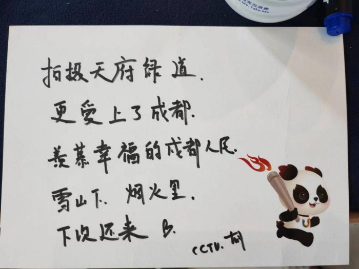 “拍摄天府绿道,更爱上了成都。羡慕幸福的成都人民,雪山下,烟火里,下次还来。”一位CCTV的记者在明信片上写下这行文字。在成都大运会文化展示活动中,共计收到近400封来自全球各地媒体人员的手写明信片,中文、英文、日文、德文都有,用不同文字表达着对成都的感悟和祝福。