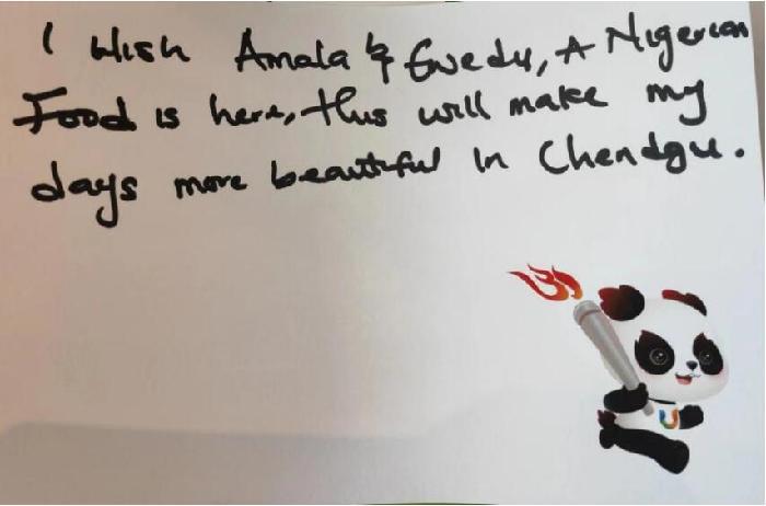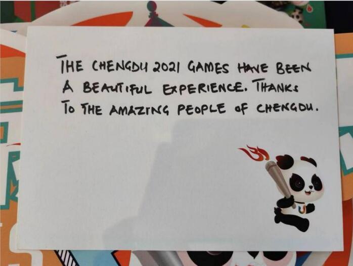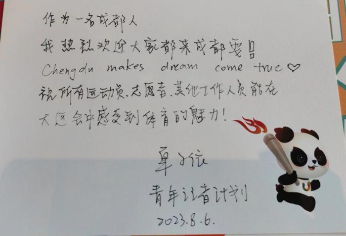 来自成都大运会青年记者计划的单子依,是一名成都人,今年刚刚保送成为北京大学新媒体研究院硕士研究生,她通过明信片表达着成都的热情好客,“欢迎大家都来成都耍!祝所有运动员、志愿者、其他工作人员能在大运会中感受到体育的魅力。”