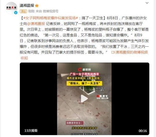 8月8日,广东惠州的许女士向记者反映,她网购了一瓶杨梅浆,将未拆封的泡沫箱放在客厅里。次日早上,她被眼前的一幕惊呆了,杨梅浆的塑料瓶子自爆了,整个客厅都是红色的痕迹。“第一次见,这是食品,又不是危险品,谁知道会爆炸。”8月9日,记者联系到涉事网店的负责人,他表示,杨梅原浆可能因为发酵产生气体引发爆炸,但很多时候是消费者迟迟不去取货导致的。“我们放置了干冰,三天之内一般没有问题。并且贴了巴掌大的提示标签,需要冷冻。”