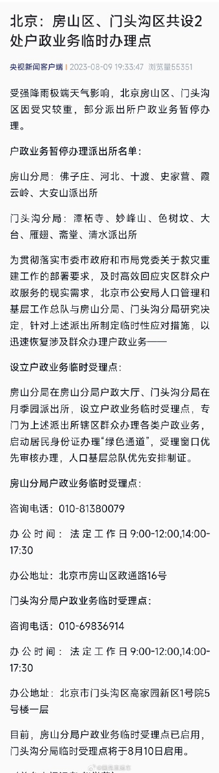 目前,房山分局户政业务临时受理点已启用,门头沟分局临时受理点将于8月10日启用。(转自 央视新闻)