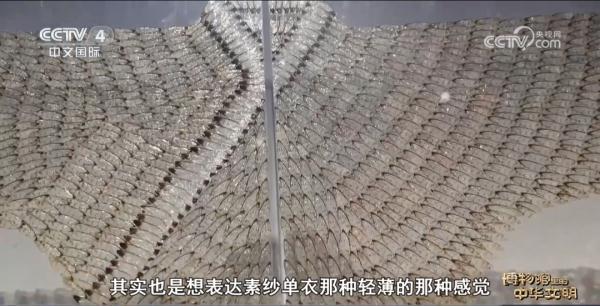 它的名字叫如蝉翼如云雾,它真的是艺术家用真实的蝉翼做出来的一件衣服,其实也是想表达素纱单衣那种轻薄的感觉。(艺术家)买了2500片的蝉翼标本,然后自己一片一片地去连接。