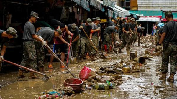 73653部队官兵在洪水退去后,一丝不苟地清理着街道上的垃圾和淤泥。