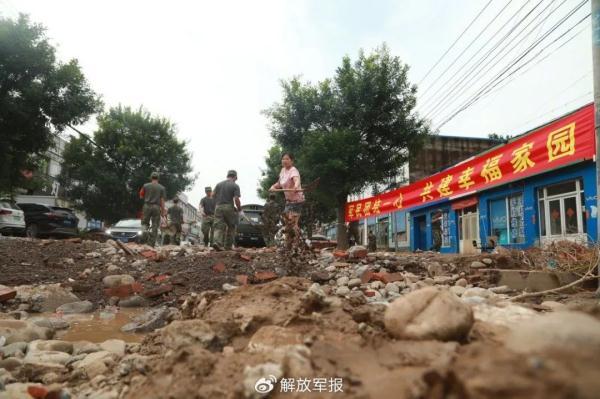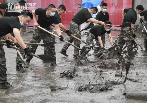 北京卫戍区某部官兵清淤排险、抢通道路、转运垃圾,全力协助灾后重建。