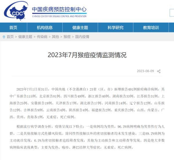 8月9日,中国疾病预防控制中心网站发布《2023年7月猴痘疫情监测情况》:2023年7月1日至31日,中国内地(不含港澳台)23省(区、市)新增报告491例猴痘确诊病例,其中广东报告115例、北京报告81例、四川报告49例、浙江报告40例、湖南报告33例、江苏报告31例、上海报告25例、安徽报告19例、天津报告17例、湖北报告17例、河南报告14例、辽宁报告12例、山东报告12例、吉林报告9例、云南报告4例、陕西报告4例、福建报告2例、重庆报告2例、山西、内蒙古、广西、贵州、青海各1例,无重症、死亡病例。