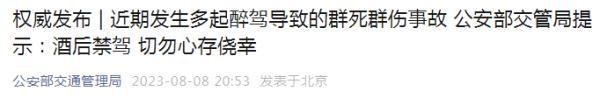 原标题:《权威发布 | 近期发生多起醉驾导致的群死群伤事故 公安部交管局提示:酒后禁驾 切勿心存侥幸》