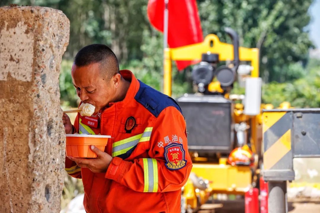 救援人员吃饭时也要在工作中的排水设备旁值守