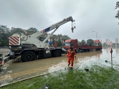 队员们迅速换上救援服,穿上雨靴,携带越野吊车、半挂车、照明车、排水泵等装备,分两组火速奔赴冠云桥、华阳桥救援现场。