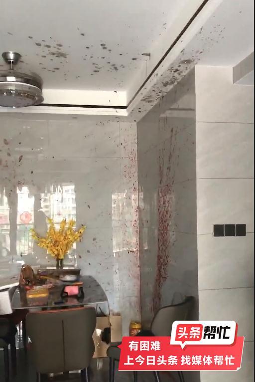 许女士拍摄的视频显示,客厅地板上全是斑斑点点的深红色痕迹,多面墙壁上的深红色痕迹呈放射状,天花板上也有大大小小的斑点状痕迹。