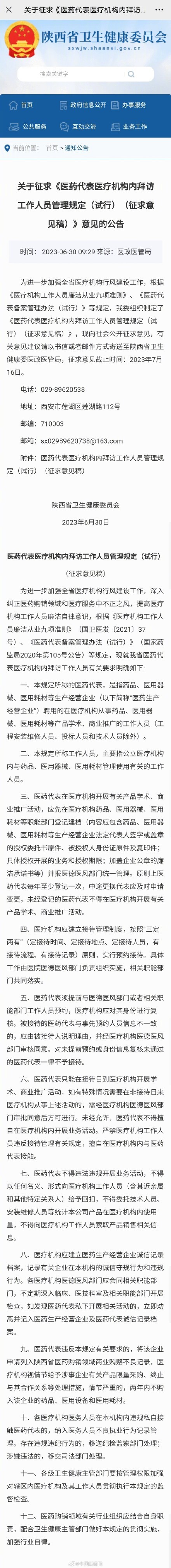 近日,医疗反腐引发全行业震动。此前,陕西省卫健委发布《医药代表医疗机构内拜访工作人员管理规定(试行)(征求意见稿)》,其中明确提出:①未经允许,医药代表不得擅自在医疗机构内开展业务活动。严禁医疗机构工作人员违反接待管理有关规定,擅自在医疗机构内与医药代表接触。②医药代表违反本规定有关要求的,将该企业申请列入陕西省医药购销领域商业贿赂不良记录。③各医疗机构医务人员在本机构内违规私自接触医药代表的,纳入医务人员不良执业行为记录管理。存在违规违纪行为的,移送纪检监察部门处理;涉嫌违法的,移交司法部门处理。(陕西省卫健委官网)