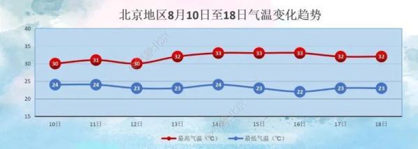 8月10日到18日,预计南郊观象台最高气温30℃至33℃,最低气温22℃至24℃。