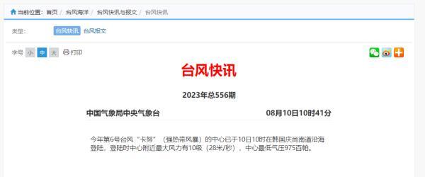 今年第6号台风“卡努”(强热带风暴)的中心已于10日10时在韩国庆尚南道沿海登陆,登陆时中心附近最大风力有10级(28米/秒),中心最低气压975百帕。