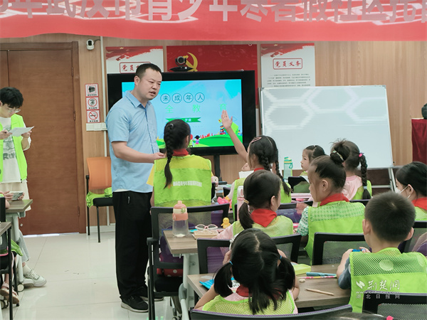 在室内课上,罗健与学生们积极互动,通过提问抢答的方式使学生们踊跃参与到课堂中来。讲课内容立足四个“安全”,将涉及校园欺凌、假期人身安全、安全用水用电等教育内容融入青少年的日常生活,将法治的“种子”播种在孩子们的心中,培养青少年遵守法律、法规、及社会公共道德规范的观念,增强青少年的爱国意识、安全意识。