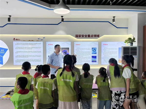 “大家知道国家安全日是几月几日吗?”“危害国家安全的行为有哪些?”现场,司法所所长罗健带领学生们参观南湖国家安全教育基地,利用基地的展板、视屏等载体向青少年们详细介绍了《国家安全法》的相关知识,让学生们明白国家安全和家庭个人的紧密联系,树立起“国家安全,人人有责”的担当意识。