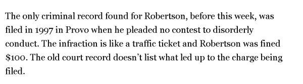 FOX13还称,在此次被FBI枪杀前,罗伯森唯一的犯罪记录是1997年的一次“扰乱治安”的记录。从当时记录来看,此事似乎是因为交通违章罚款引发的。