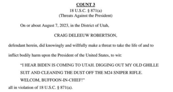 FBI枪杀罗伯森之前,已经对他提起了三项指控,分别是跨州威胁他人、威胁美国总统、威胁报复联邦执法人员。