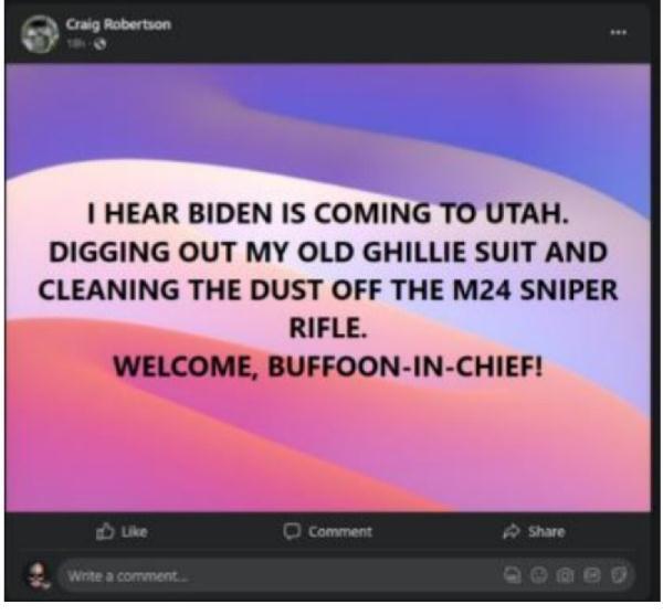 美国有线电视新闻网(CNN)在报道中大量引述了FBI方面给出的说法及其对罗伯森的指控,称罗伯森之所以周三一早被FBI找上门,是因为拜登将于周三晚间在犹他州发表演讲,而罗伯森此前曾发帖威胁说他会拿“狙击枪”去“招待”拜登这个“小丑总司令”。