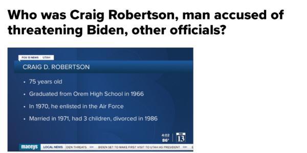 但美国福克斯新闻网在犹他州的地方台FOX13表示,尽管FBI用来指控罗伯森的那些帖文令他看起来像个暴力的危险分子,但他实际上一直过着“平静”的生活,曾是一名建筑检验员,还曾于1970年入过伍,在美国空军当过兵。