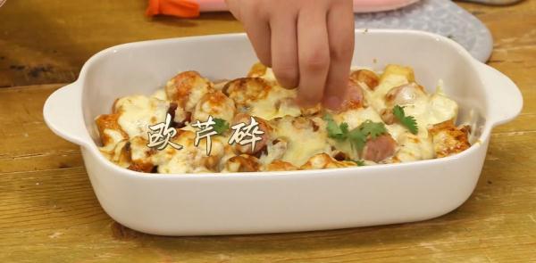 炸好的土豆和香肠淋入酱料,撒上芝士,放入烤箱中230℃烤制5分钟,最后撒上欧芹碎即可。