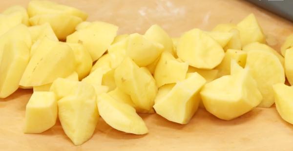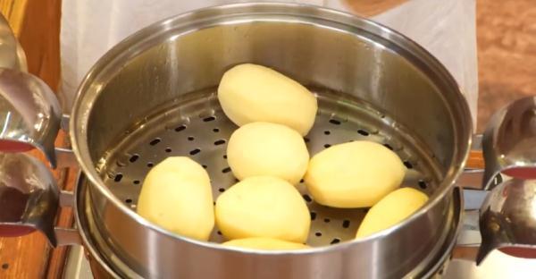 料水中加入土豆,煮制4分钟后捞出沥干水分。