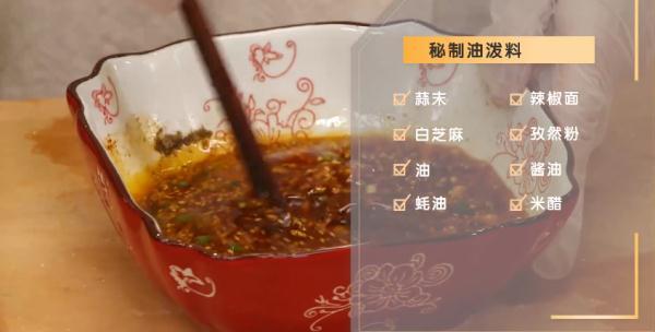 碗中加入蒜末、辣椒面、白芝麻、孜然粉,泼上热油,加入酱油、蚝油、米醋制成料汁。