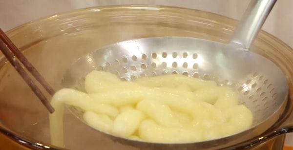 将土豆压成土豆泥,加入土豆淀粉,搅拌均匀,揉成粉团,取适量粉团搓成条状。