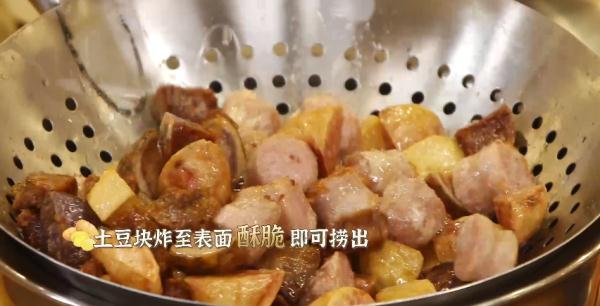 油温200℃时,加入煮好的土豆炸制,土豆炸至表面酥脆时下入香肠过油。