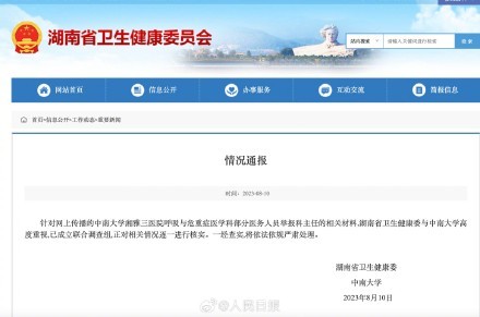 据湖南省卫健委官网:针对网上传播的中南大学湘雅三医院呼吸与危重症医学科部分医务人员举报科主任的相关材料,湖南省卫生健康委与中南大学高度重视,已成立联合调查组,正对相关情况逐一进行核实。一经查实,将依法依规严肃处理。