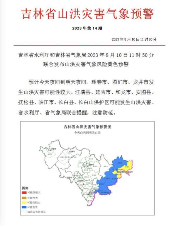 吉林省水利厅和吉林省气象局2023年8月10日11时50分联合发布山洪灾害气象风险黄色预警:预计今天夜间到明天夜间,珲春市、图们市、龙井市发生山洪灾害可能性较大。汪清县、延吉市、和龙市、安图县、抚松县、临江市、长白县、长白山保护区可能发生山洪灾害。省水利厅、省气象局联合提醒,注意防范。