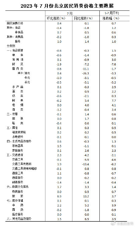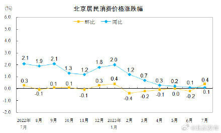2023年7月份,北京居民消费价格环比上涨0.4%。其中,食品价格下降1.4%,非食品价格上涨0.7%;消费品价格下降0.2%,服务价格上涨1.0%。