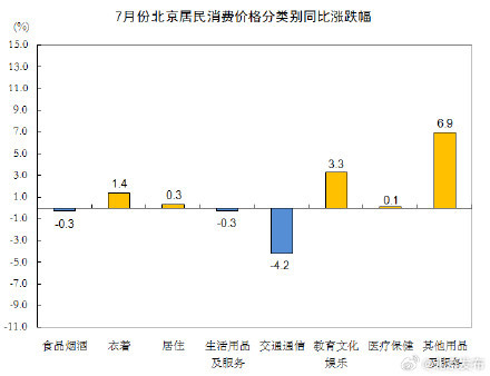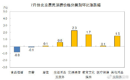 7月份,北京居民消费价格同比上涨0.1%。其中,食品价格下降1.8%,非食品价格上涨0.5%;消费品价格下降1.0%,服务价格上涨1.4%。