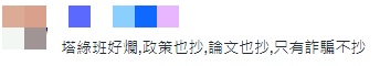 对此,有岛内网友在台媒留言称,“塔绿班(民进党)好烂,政策也抄,论文也抄,只有诈骗不抄”。↓