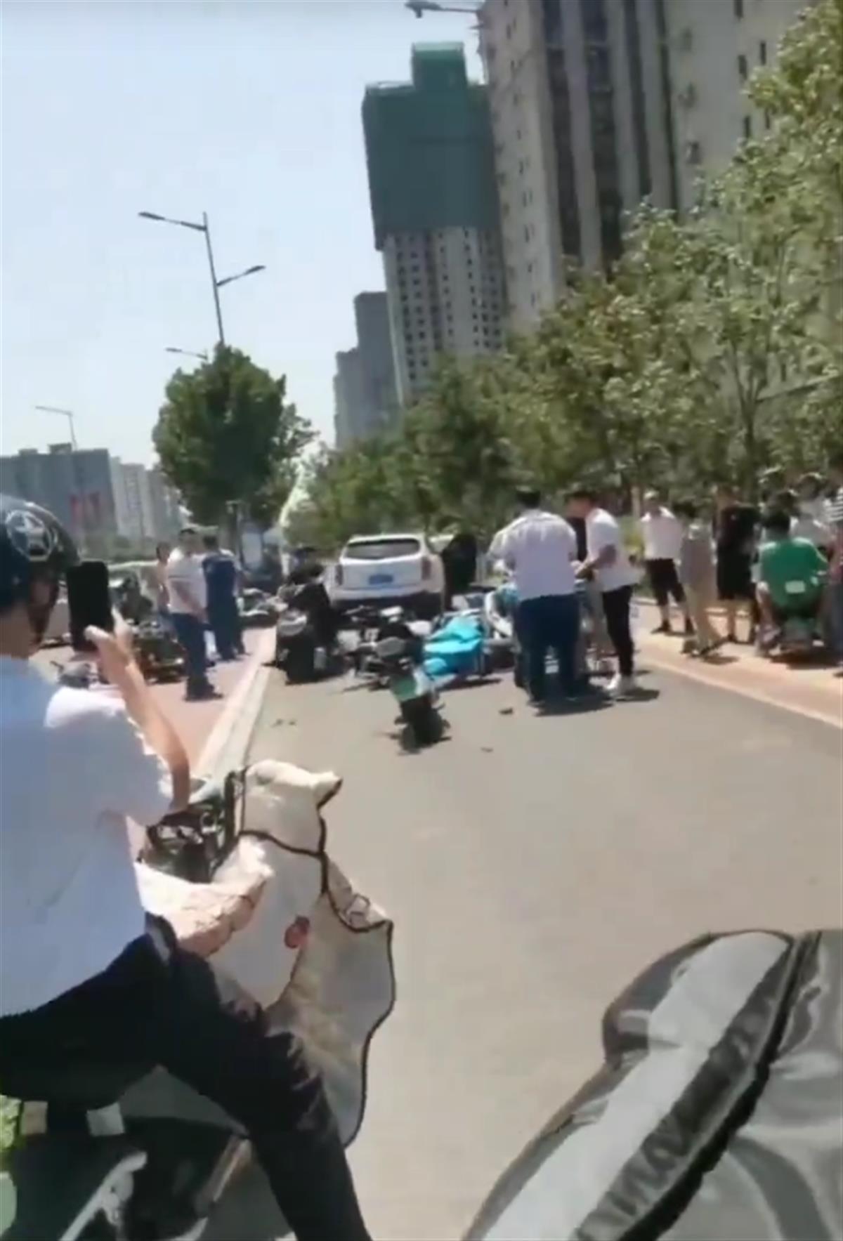 网络视频显示,一辆白色SUV车辆停在路上,前保险杠受损脱落,多辆电动自行车横七竖八地倒在车子周围,多名伤者或坐或躺在地上,现场一名女子发出哭喊声。有救护车赶到现场,将伤者抬上担架。